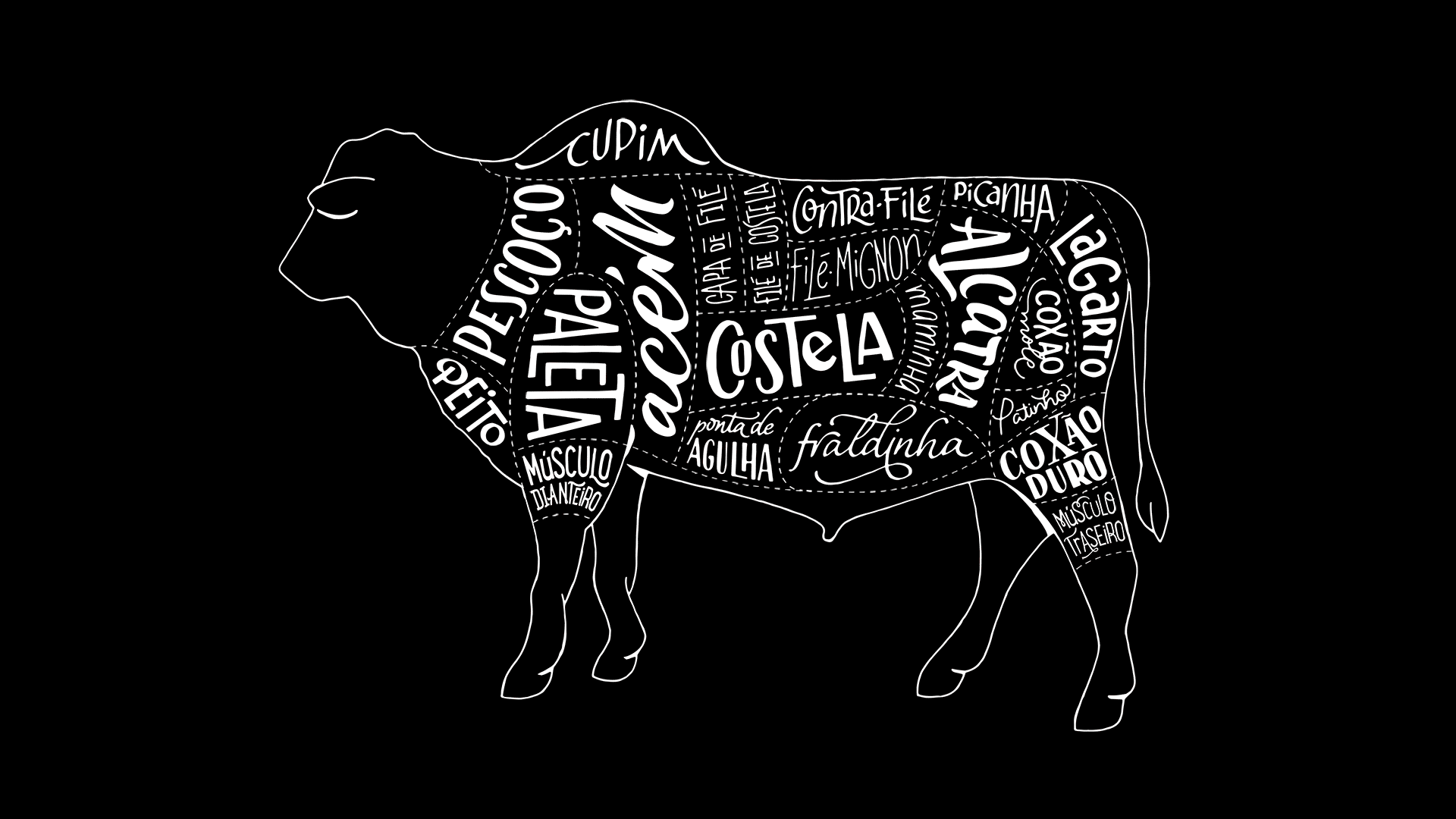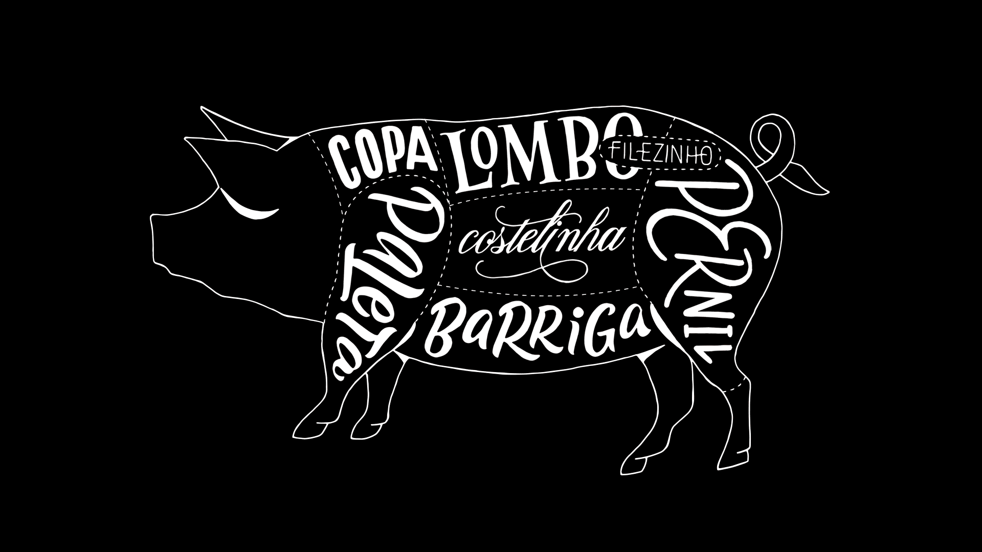 Série de ilustrações com as representações de cortes para suínos, aves e bovinos, desenvolvidas para a ambientação da área de açougue dos Supermercados Mambo.