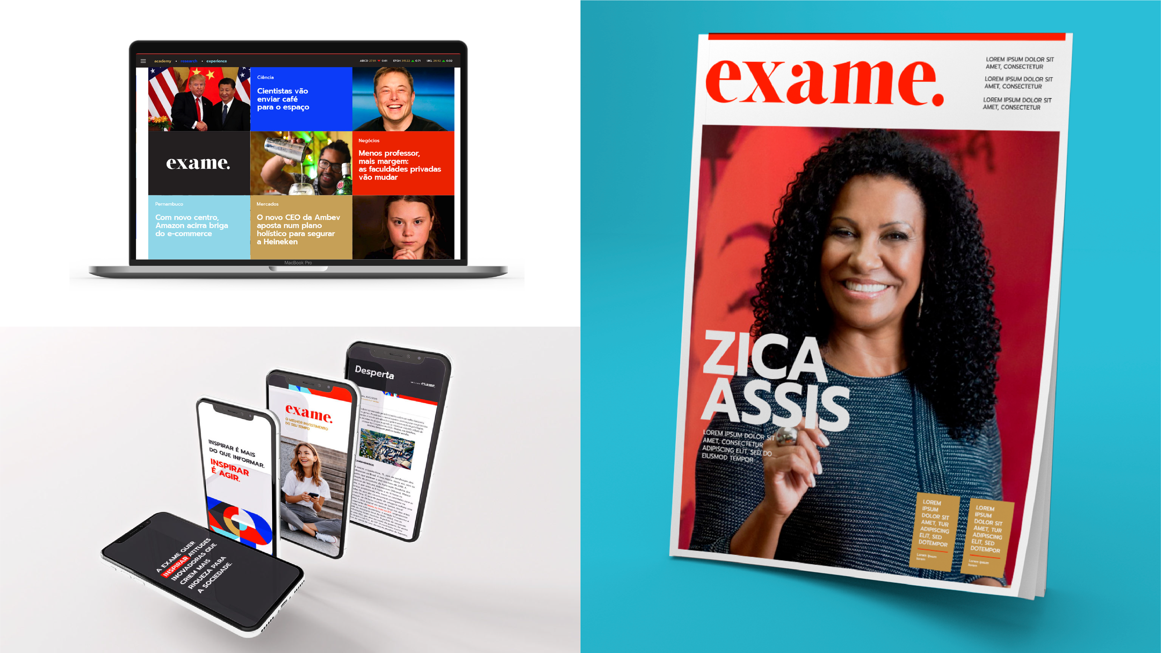 A revista Exame é uma das líderes de mercado quando o assunto é negócios, e além de informar é o principal veículo de desenvolvimento pessoal, profissional e empresarial. Em 2020 a revista passou por um reposicionamento da marca que foi brilhantemente conduzido pela Brand Gym e eu fui convidado para fazer o refino tipográfico da marca. O refinamento tipográfico de um logotipo é um trabalho minucioso que, através do conhecimento tipográfico, busca nos detalhes de uma composição deixar todos os elementos harmônicos e melhorar sua legibilidade e aplicabilidade. A marca desenvolvida pela Brand Gym utilizou uma tipografia serifada, com muito contraste e em caixa baixa, pouco usual nas publicações impressas, mantendo a tradição mas comunicando que a empresa está em um novo momento. Ser diferente e novo, sem deixar de ser o que era antes.