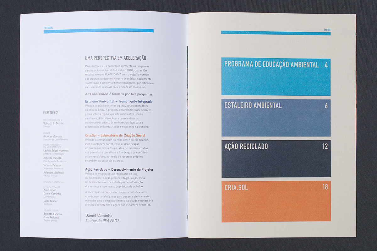 Revista para Programa de Educação Ambiental do Estaleiro ERG2, em Rio Grande, RS, desenvolvido junto com a Nômade para a Engevix. 2013.